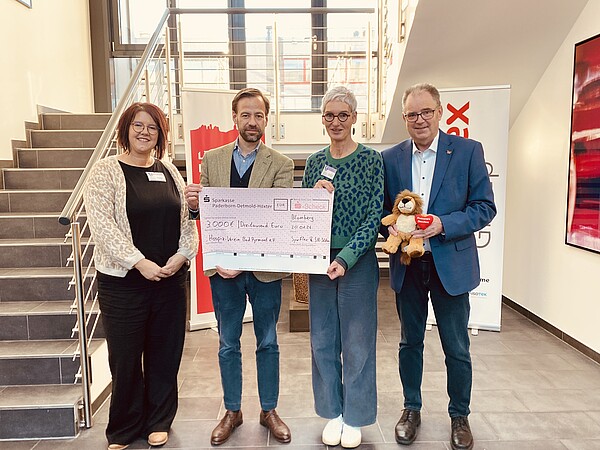 Im Rahmen eines Besuchs bei der SynFlex wurde dem Hospiz-Verein eine Spende in Höhe von 3.000 Euro überreicht. Die Spende ist Teil einer jährlich wiederkehrenden Aktion: Die Mitarbeiterinnen und Mitarbeiter von SynFlex sammeln die Summe im Rahmen der Weihnachtsfeier. Der gesammelte Betrag wird durch SynFlex zusätzlich aufgestockt wird. Ergänzt wurde in diesem Jahr die Unterstützung durch eine weitere Spende der Schwering & Hasse Stiftung.